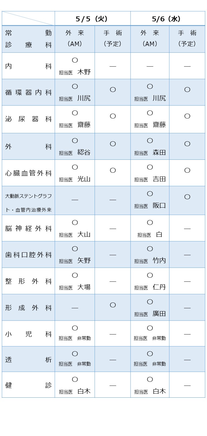 徳洲会グループの方針により、下記日程は通常の平日と同様の体制で